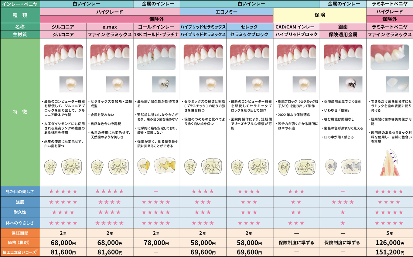 治療計画作成時の参考資料として提案、お見せしているものです。材質、技術、多様化しています。どうぞ参考になさって、御相談ください。
